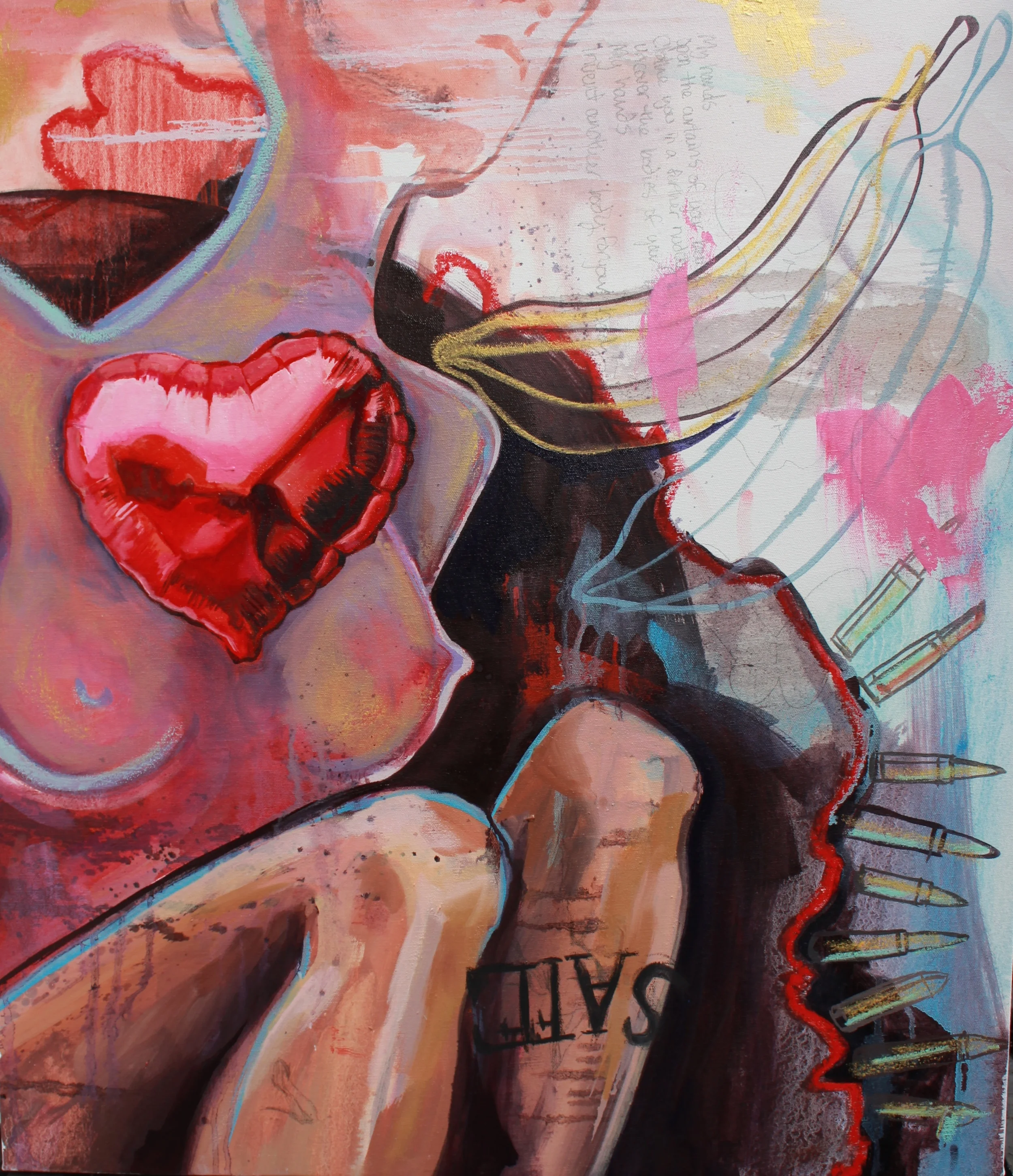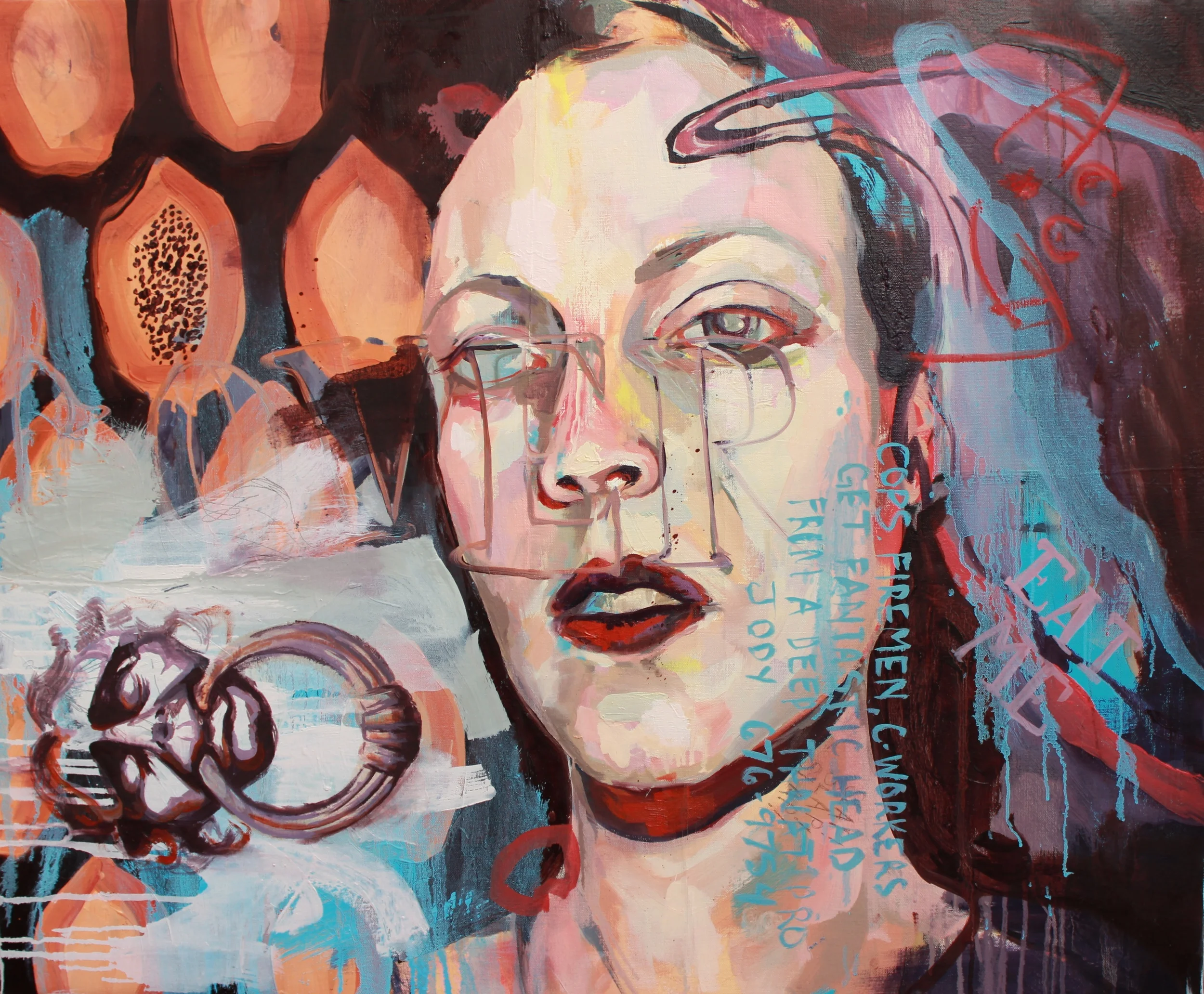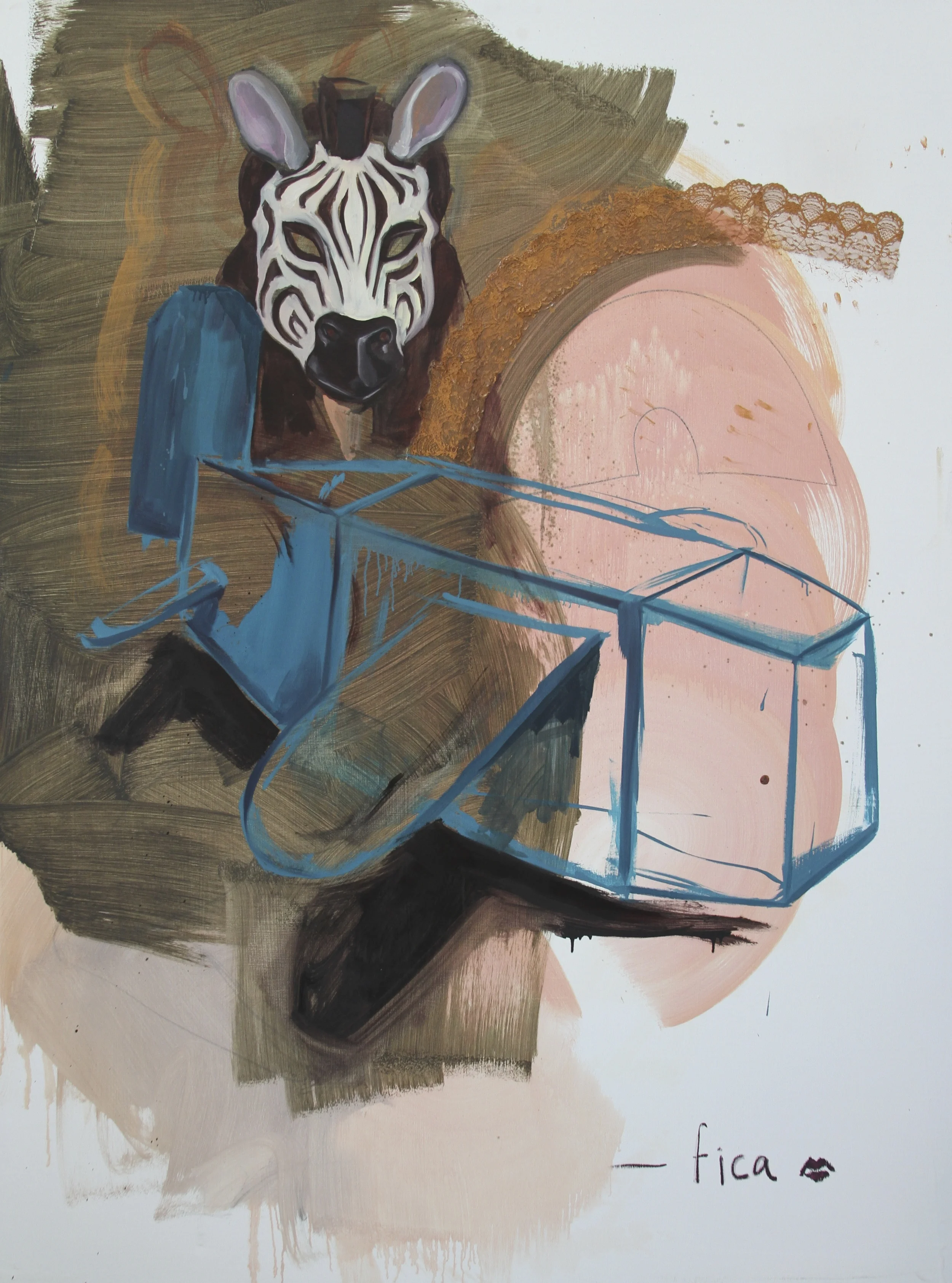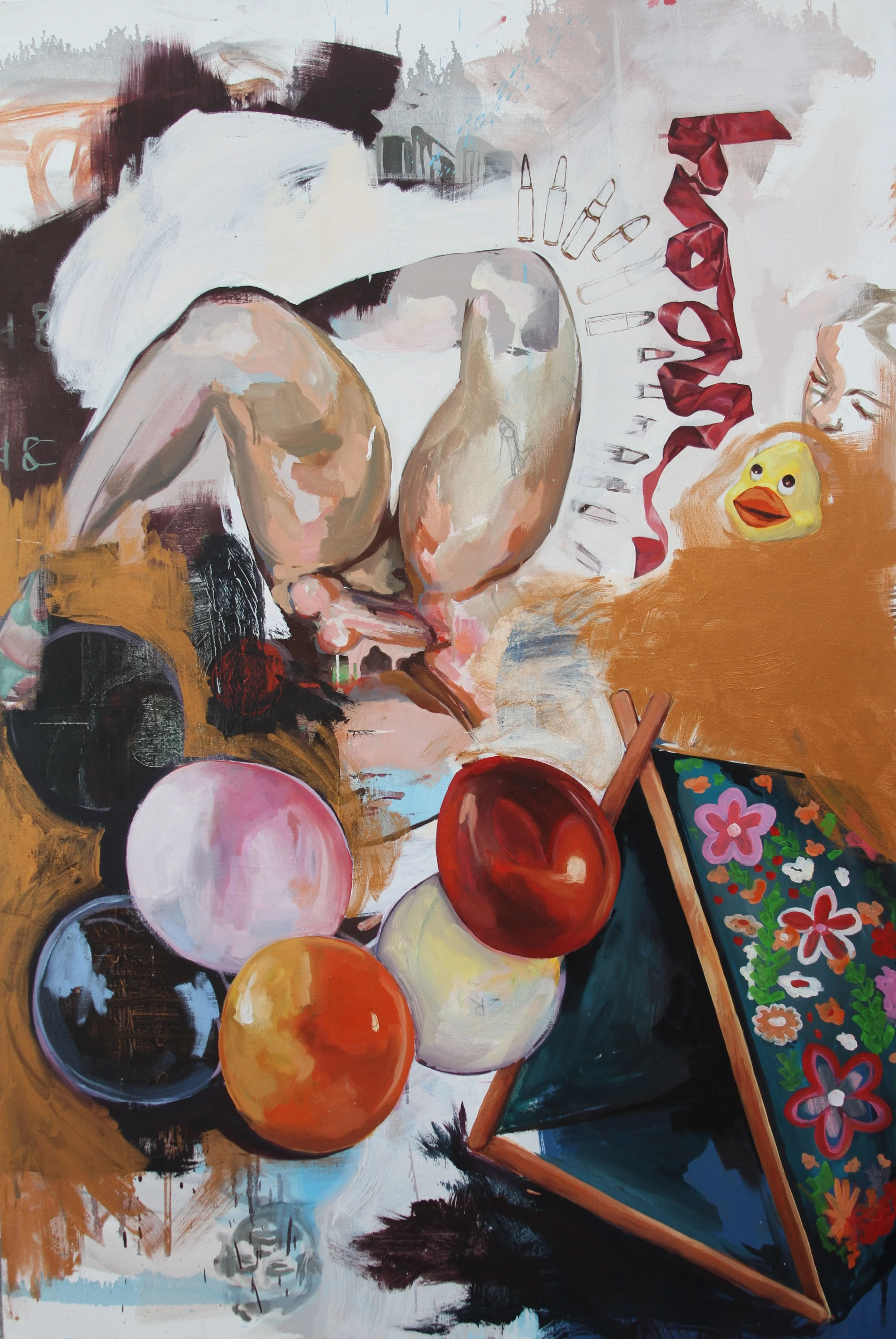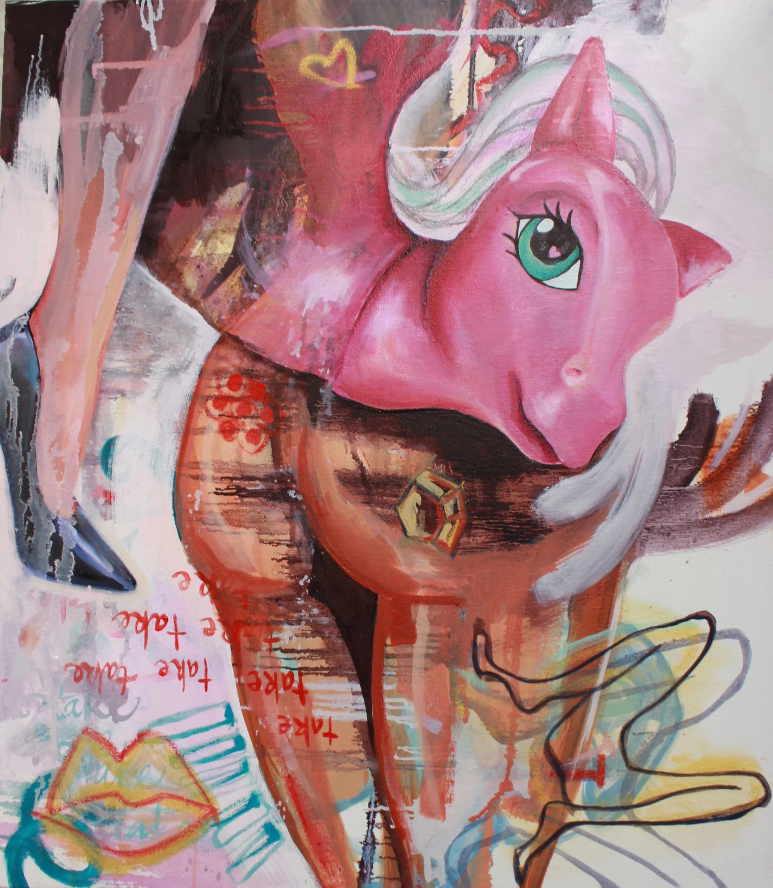Oil, lace, lipstick on canvas