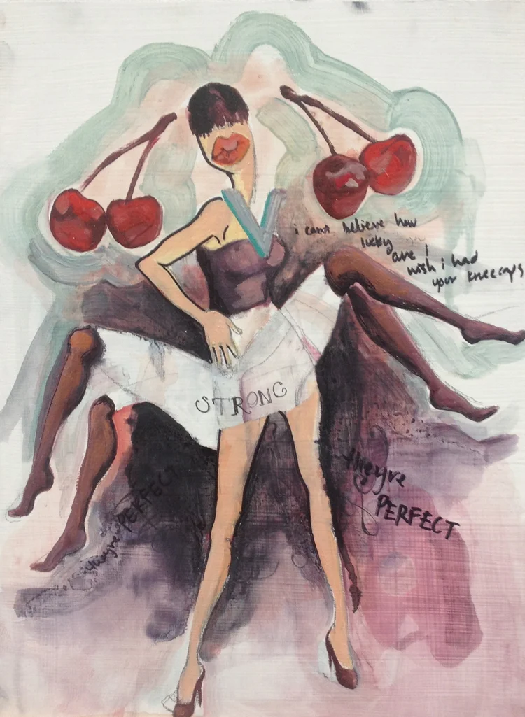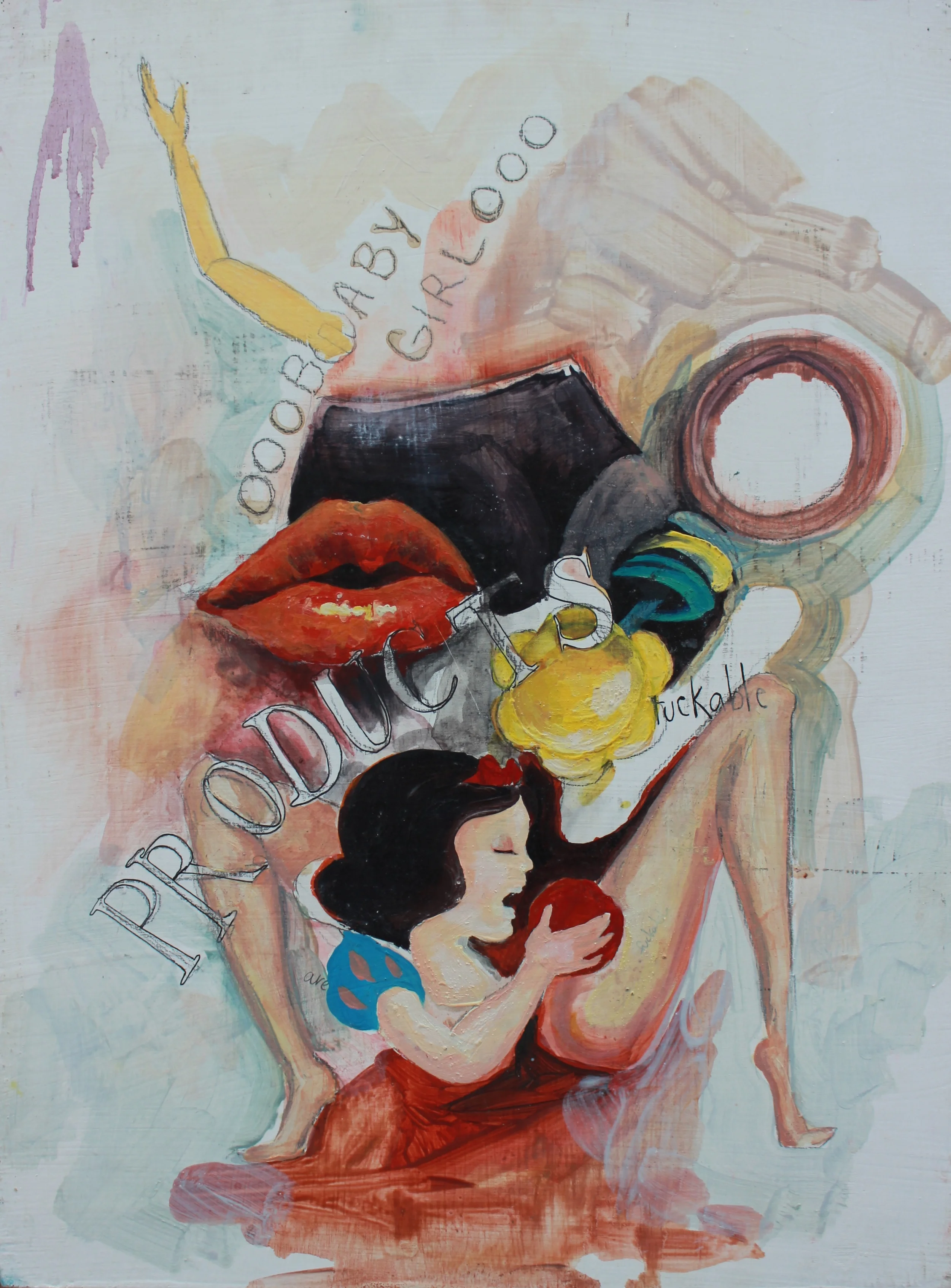 Made Fresh Daily is a series where I investigate the social phenomenon of commodifying and commercializing female sexuality, which is the foundation of exploitation, violence, and abuse. I examine the socially constructed bounds of girlhood and challenge hegemonic and misogynistic parameters within Western society. I use painting to create collages to replicate the proliferation of repetitive imagery that reinforces and perpetuates a societal norm of standardized identity for women.